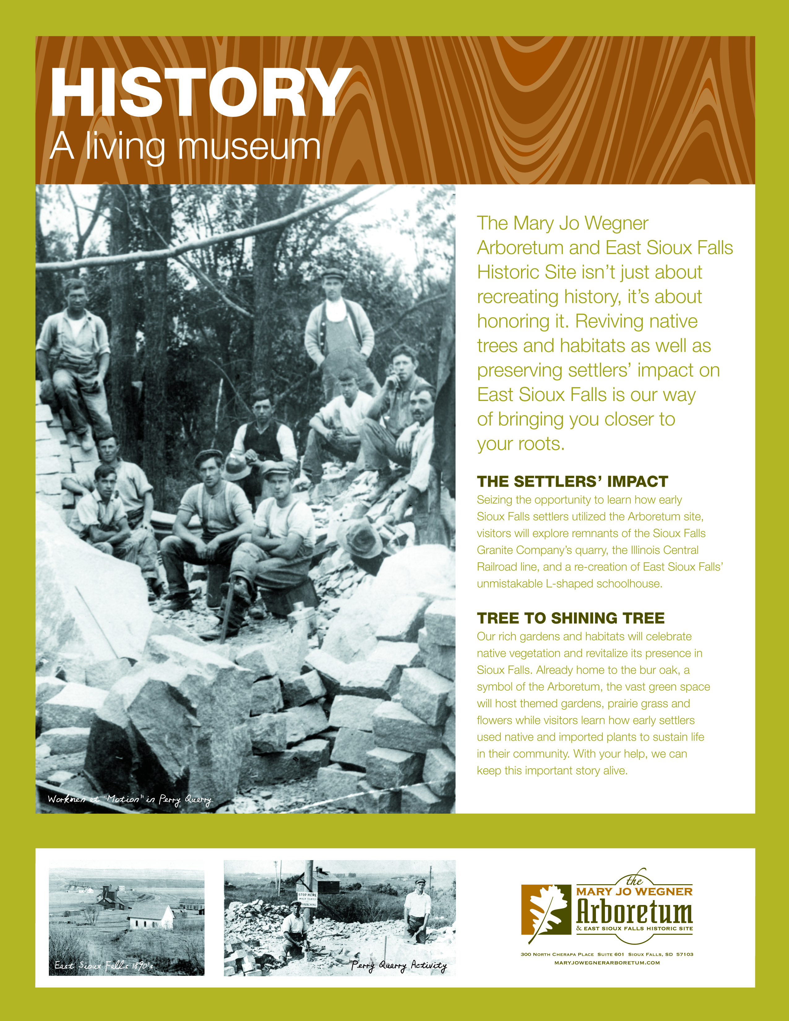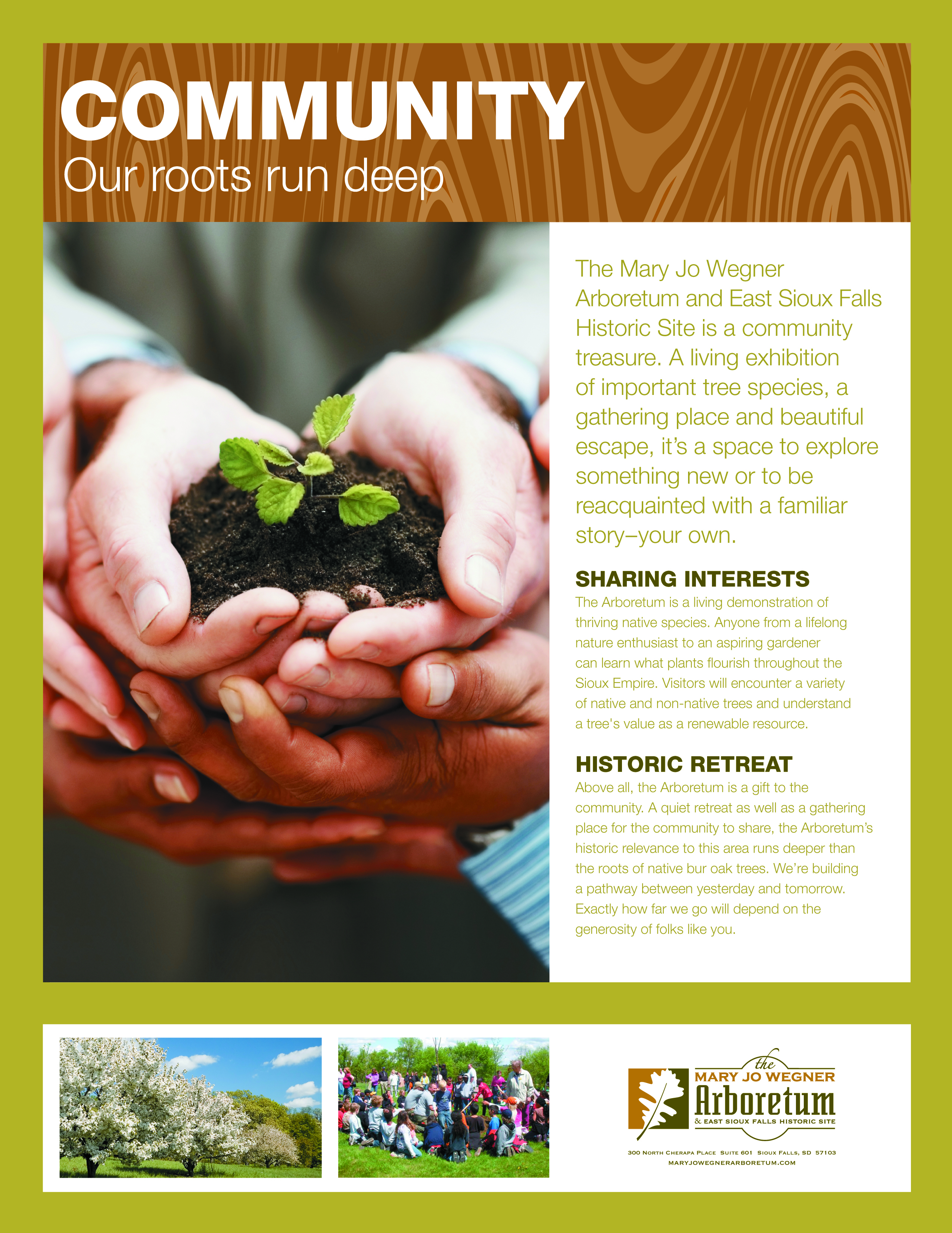 The Mary Jo Wegner Arboretum and East Sioux Falls Historic Site is a community treasure. A living exhibition of important tree species, a gathering place and beautiful escape, it’s a space to explore something new or to be reacquainted with a familiar story–your own.