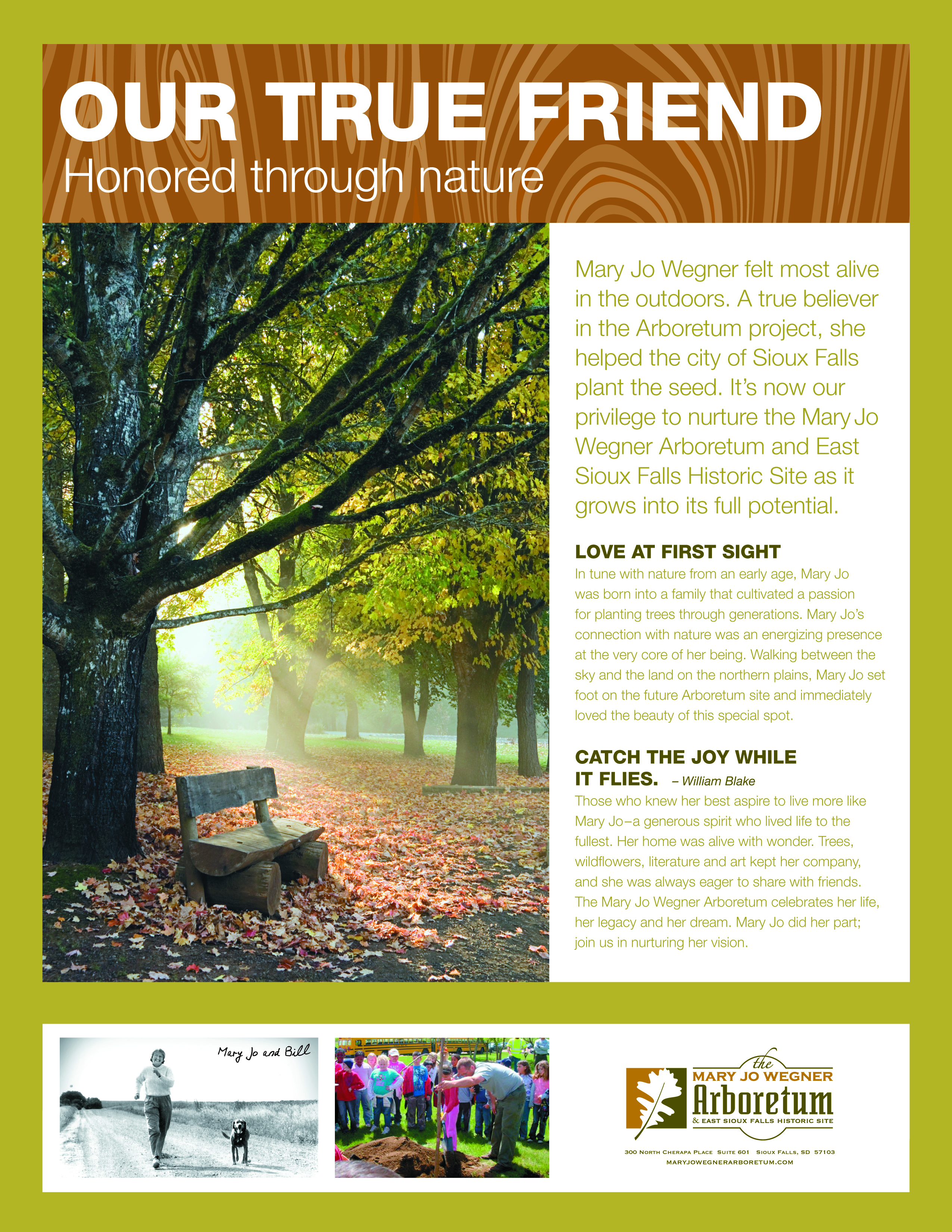 Mary Jo Wegner felt closer to life when she was outside. A believer in the Arboretum project, she helped the city of Sioux Falls plant the seed. It's up to us now to nurture the Mary Jo Wegner Arboretum and East Sioux Falls Historic Site into its fullest potential.