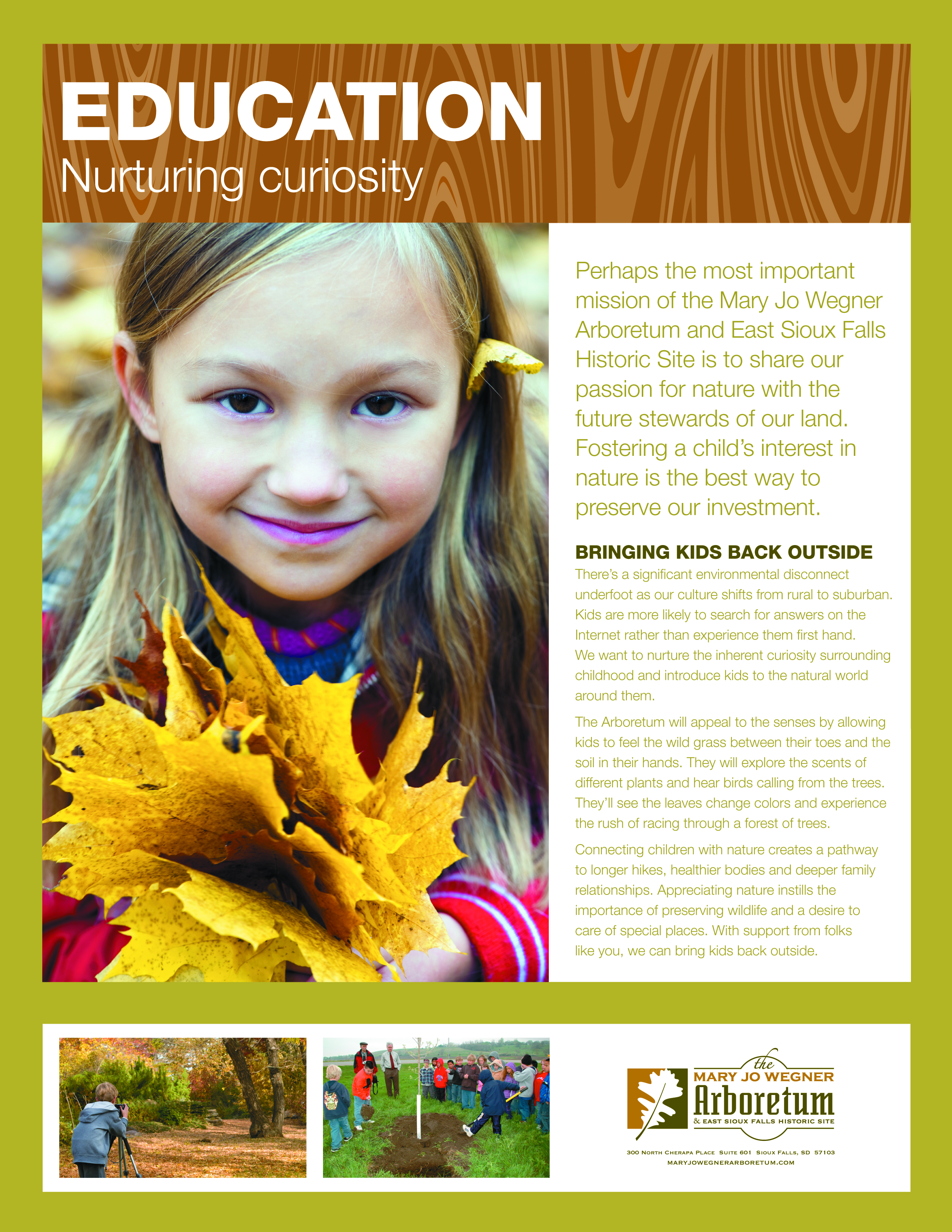 Perhaps the most important mission of the Mary Jo Wegner Arboretum and East Sioux Falls Historic Site is to share our passion for nature with the future stewards of our land. Fostering a child’s interest in nature is the best way to preserve our investment.